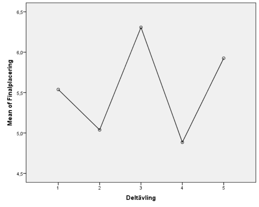 Spelar det någon roll ifrån vilken deltävling ett bidrag kommer ifrån? Ja, det är faktiskt en viss skillnad, även om sambandet inte är signifikant. Som vi kan se på diagrammet så är det lättare att vinna Melodifestivalen om man kommer ifrån deltävling 4 – än om man kommer från deltävling 3. Det kan finnas goda förklaringar till detta: de som vann deltävling 4 ligger kanske färskast på minnet inför finalen – alltså samma effekt som vi såg att sista startnumret hade i själva finalen. Vi minns exempelvis Måns Z som vann ifjol – han tävlade i sista deltävlingen innan. Likaså Robin Stjernberg (2013) och Charlotte Perrelli (2008).